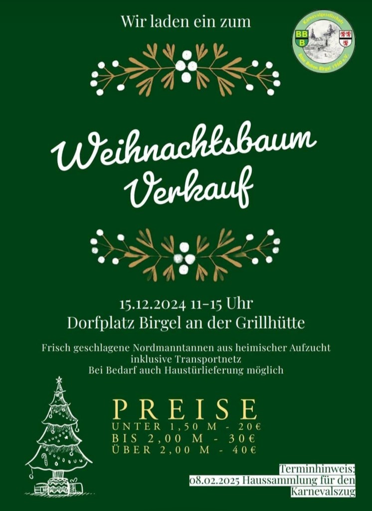Wie jedes Jahr findet diesen Sonntag wieder unser Weihnachtsbaumverkauf auf dem Dorfplatz an der Grillhütte in Birgel statt. Wir freuen uns auf euren Besuch. Ein Transport direkt zu euch nach Hause ist bei Bedarf auch wieder möglich.