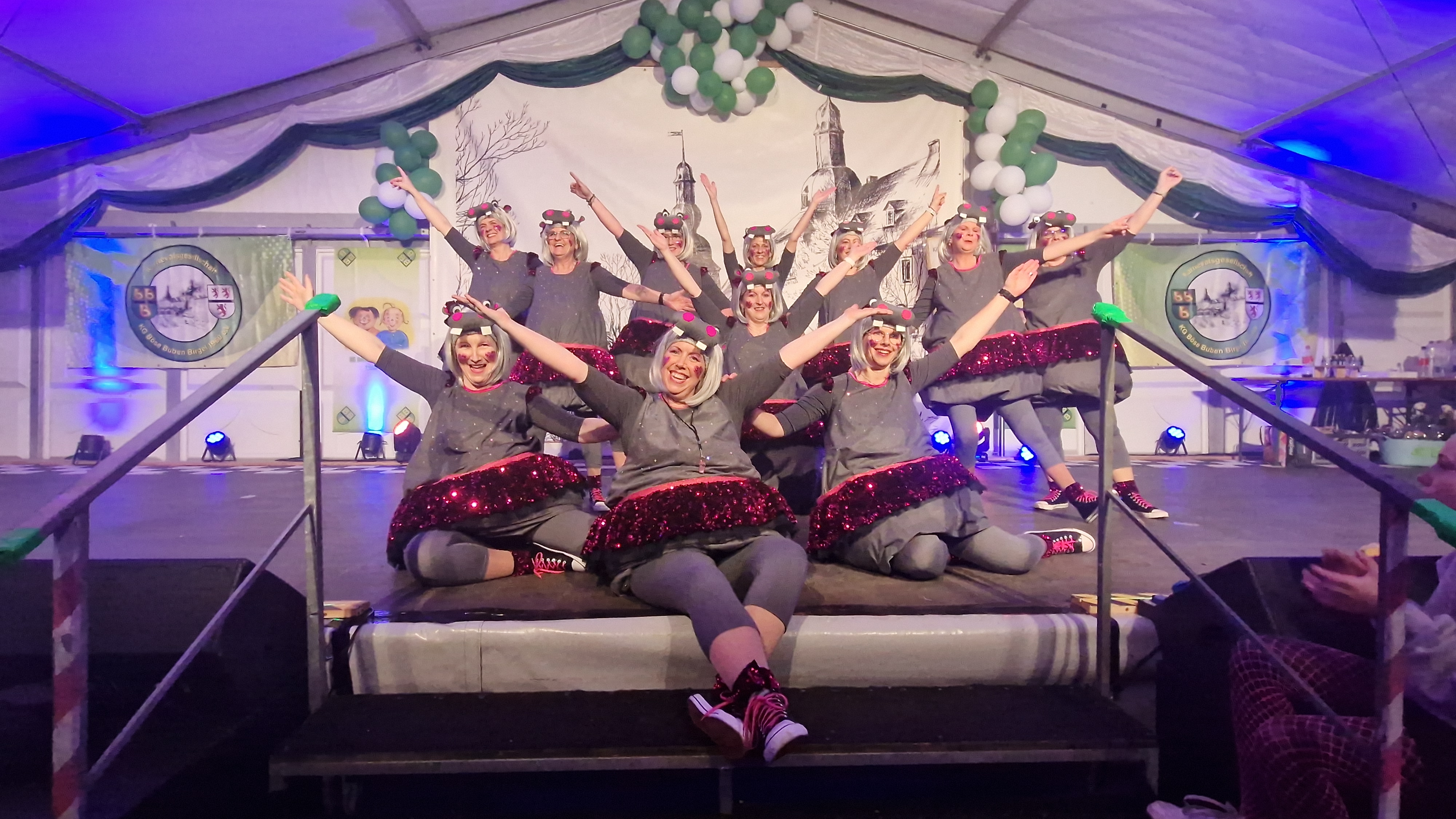 Wir eroberten die Bühnen des Dürener Umlandes mit viel „Spaß an der Freud“ als Putzfrauen, Planschbecken, Bauarbeiter, Sektflaschen und Kölner Dom. Das Nähen der Kostüme ist eine Gemeinschaftsproduktion in mühevoller Kleinarbeit. Einige sind Meisterinnen an der Nähmaschine, andere haben das Zuschneiden, Kleben und Bügeln perfektioniert. Dass wir unsere Kostüme zum Schluss so toll finden, liegt vor allem auch daran, dass wir damit auch die schönen gemeinsamen Stunden des Werkelns verbinden und dabei viel Lachen können. Dies führte auch noch dazu, dass der Großteil von uns sich nochmal trifft, wenn alle Schautanzkostüme fertig sind, denn dann geht es an die Kostüme für den Birgeler Kostümball. Innerhalb kürzester Zeit muss nochmal die Schere und die Nähnadel geschwungen werden – zeitlich und optisch fast immer eine Meisterleistung.